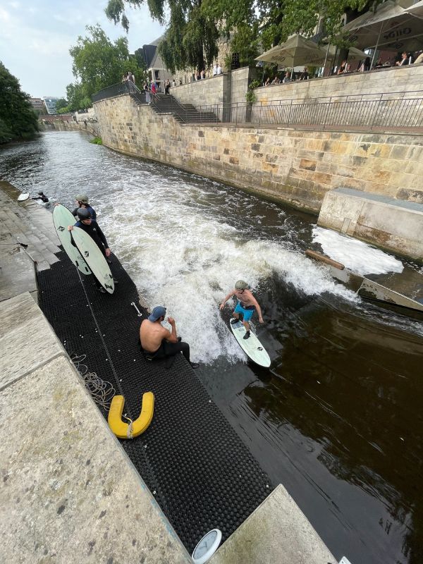 Eigenständig lernen: Du bist wahrscheinlich hier, da du es richtig lernen und nicht nur einmal einen Kurs machen willst. Dann bieten sich Flusswellen deutlich mehr an, da sie kostengünstiger sind. Optimale Anfängerwellen sind die Floßlände in München und der Almkanal in Salzburg. Der Einstieg in die Welle fällt hier sehr leicht und beide sind komplett kostenlos. Bei der Floßlände gibt es jedoch Öffnungszeiten auf die du achten musst. Natürlich kannst du auch auf der Fuchslochwelle in Nürnberg oder der Leinewelle in Hannover das Surfen lernen. Hier sind die Wellen jedoch schon ein bisschen stärker, trotzdem ist dies gut möglich. Jedoch müssen hier immer lokale Gegebenheiten gecheckt werden. Z.B. ist es an der Leinewelle minderjährigen Surfer:innen nur als Vereinsmitglied zu bestimmten Jugendslot erlaubt zu surfen. Erwachsene Surfer:innen können auch als Gäste jederzeit kommen. Bei der Fuchslochwelle muss auf die jeweils angebotenen Zeiten geschaut werden.