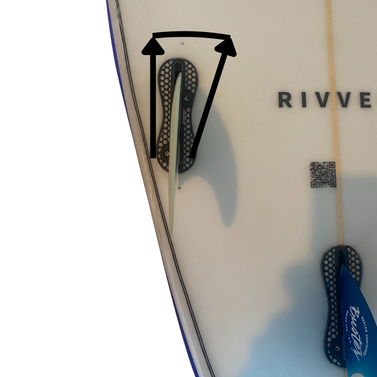 Cant bezieht sich auf den Winkel, mit dem die Finne auf dem Board positioniert ist. Wenn die Finne gerade auf dem Board steht (0 Grad Cant / Winkel), ermöglicht dies schnelles und gerades Fahren. Allerdings reagiert die Finne in Kurven weniger agil. Ein größerer Winkel (Cant) hingegen gewährleistet, dass das Board auch in Kurven mehr Vortrieb beibehält.